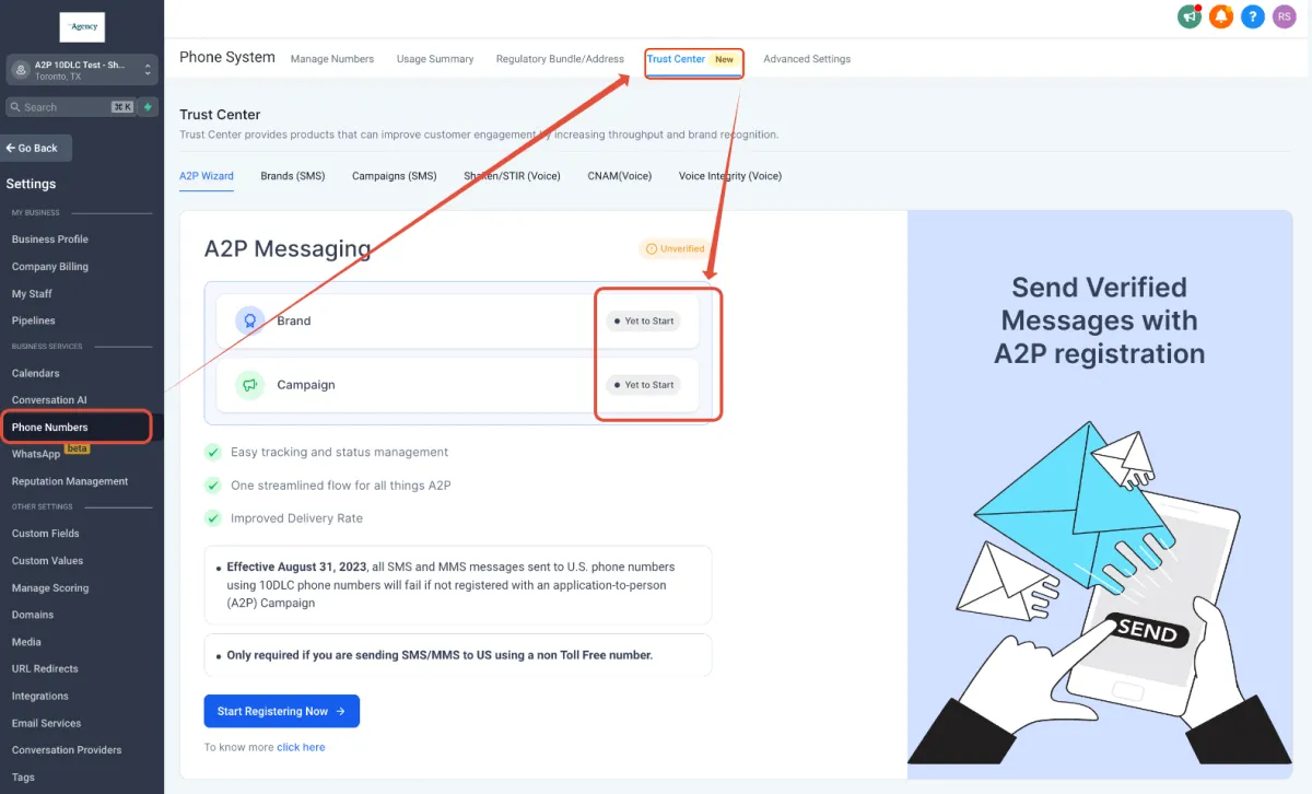 Registration is done entirely through the Phone System Trust Center. We have integrated with The Campaign Registry (TCR) to meet carriers' requirements while making it easy for businesses to onboard.