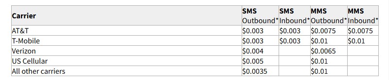 There are additional carrier fees per message that are automatically applied based on the end-user's destination and carrier.