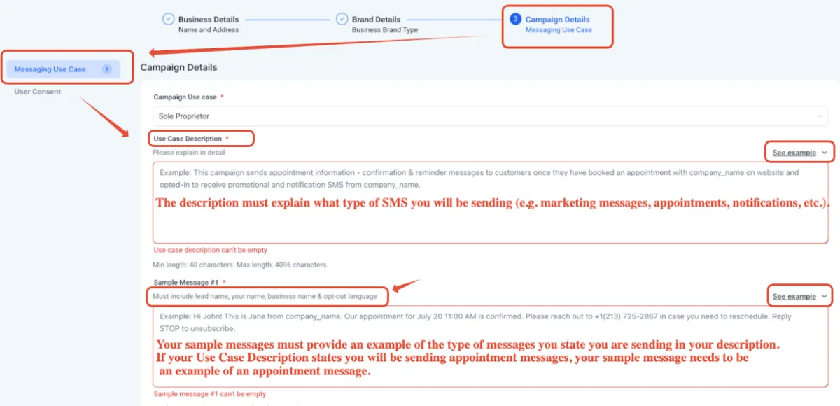 Must explain what type of SMS the client will be sending (e.g., marketing messages, appointments, notifications, etc.).
