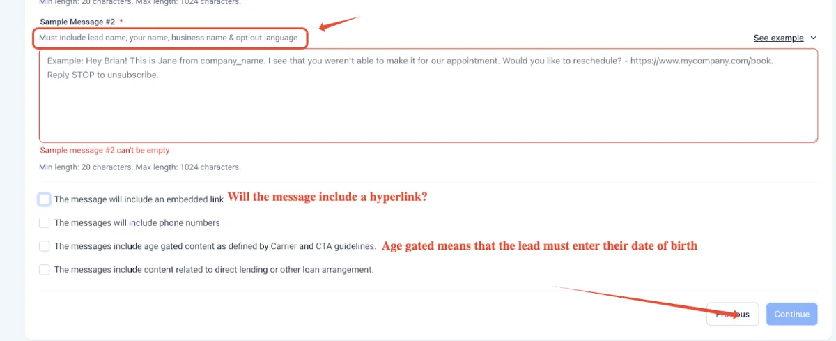 Sample Message #1 & #2 refers to the sample messages you provide as part of your application for A2P10DLC campaign submission. These examples demonstrate the kind of SMS content you intend to send to your audience. The goal is to give carriers a clear idea of your messaging purpose, format, and compliance with regulations.