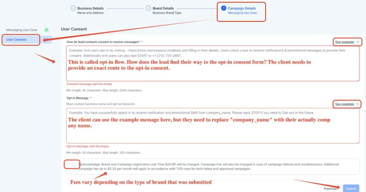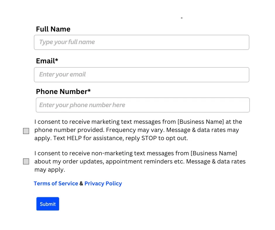 e.g. End users opt in through an appointment form on the website: https://www.abccompany.com/appointment, Users check a box with optional consent language to receive messages from us to provide their consent at the end of the appointment form: https://storage.googleapis.com/msgsndr/RNTEDRA9ap9xSh2MyTYS/media/669825fa23e0faf564cdb24f.png
