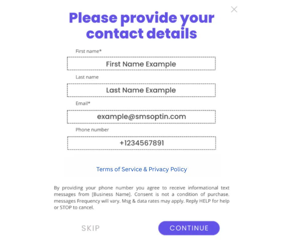 Opt-in consent message and checkbox must be separated from the "Privacy Policy | Terms of Service" consent and check box.