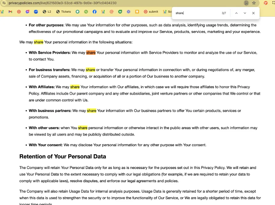Find Keywords: Look for words like share, disclose, sell, affiliate, and third-party.